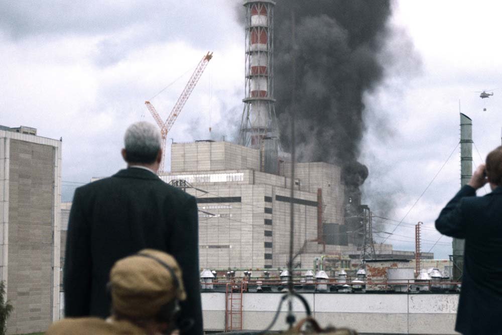Equipos de emergencia atienden el incendio luego de la explosión del núcleo del reactor. A la izquierda, la escena de la serie de HBO; a la derecha, una fotografía de 1986.