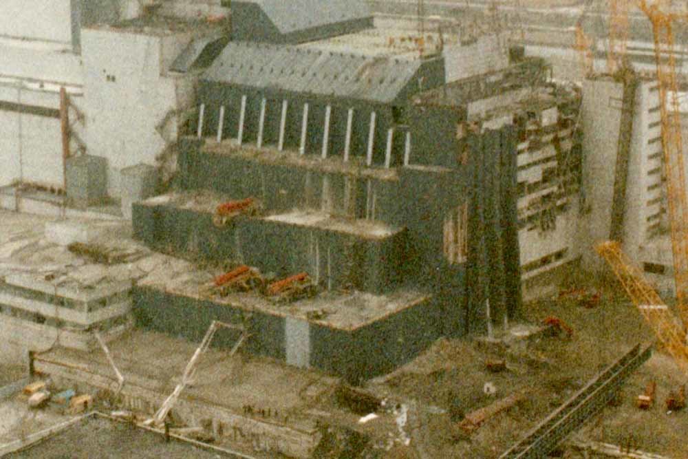 El fotograma de la serie 'Chernobyl', a la izquierda, muestra a los protagonistas frente al reactor nuclear humeante. En la imagen de la derecha se ven los daños en la planta nuclear real y fue tomada en 1986, el mismo año que ocurrió el accidente.