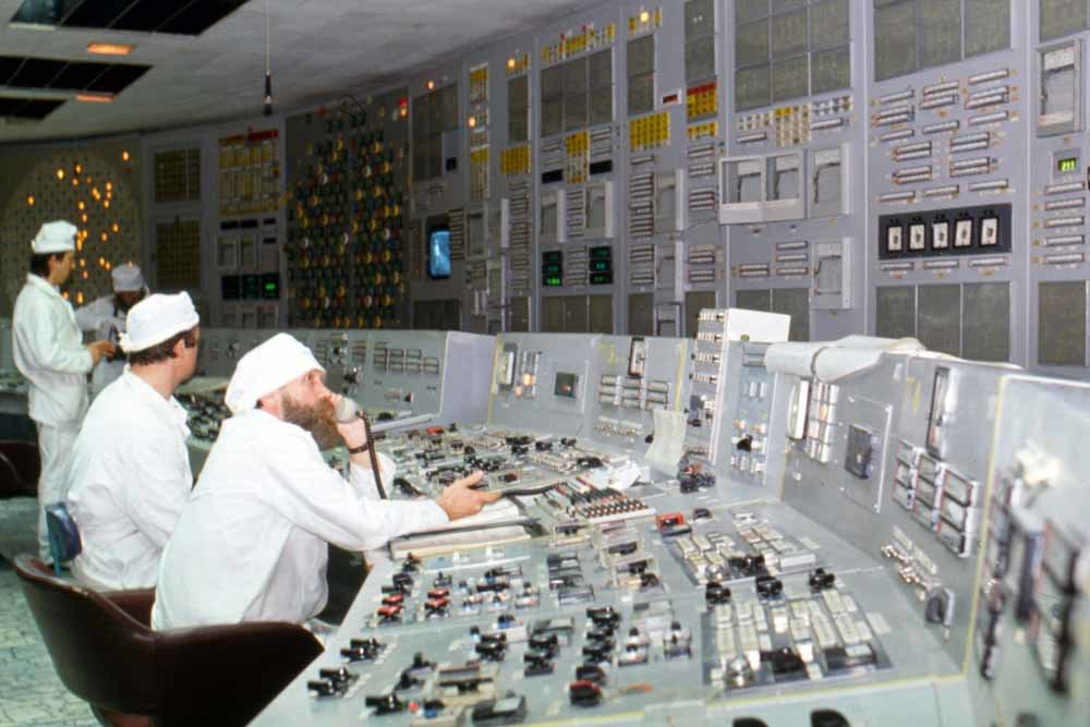 A la izquierda, una escena de la serie en el cuarto de control de la planta de Chernóbil. A la derecha, una fotografía que fue tomada unos meses antes de la catástrofe en la planta real.