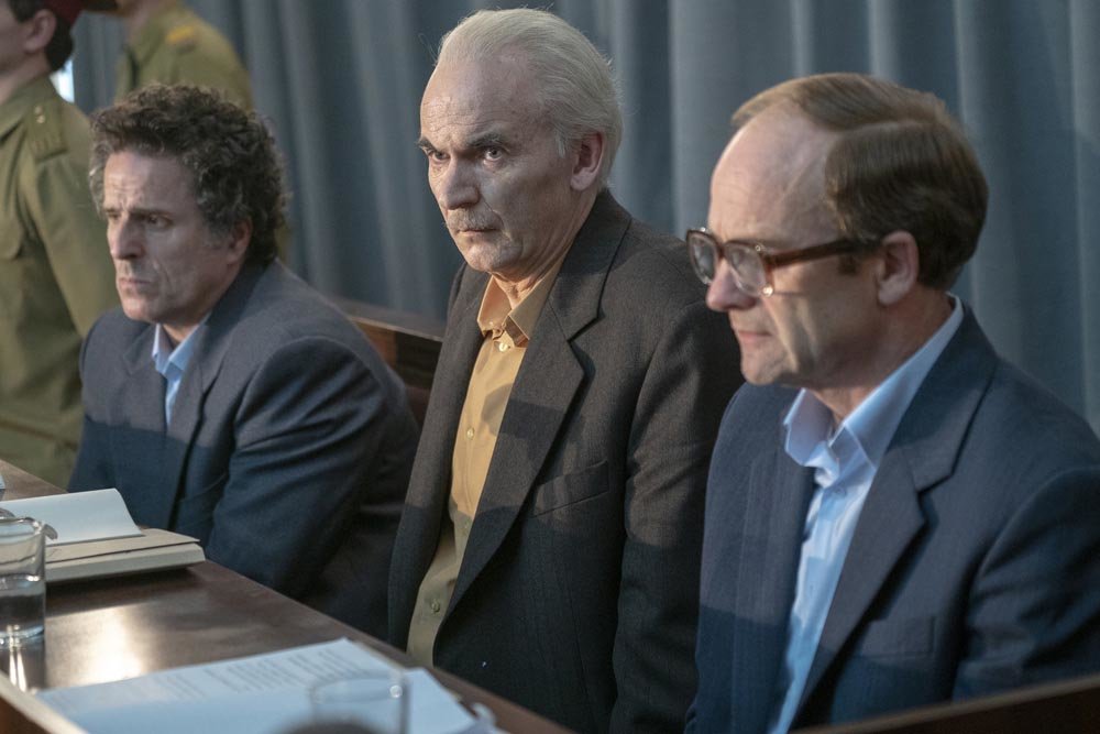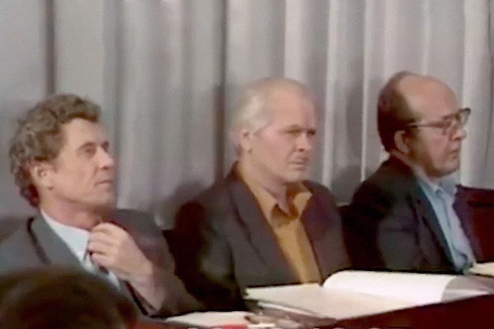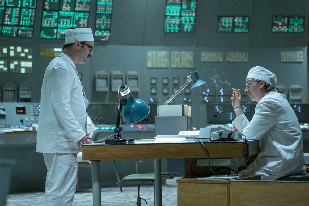 La fotografía de la izquierda muestra a los actores Con O'Neill, Paul Ritter, Adrian Rawlins, quienes interpretan a Viktor Bryukhanov, Anatoly Dyatlov y Nikolai Fomin, responsables de la planta nuclear la noche del accidente. A la derecha, los personajes reales en un video de la época.