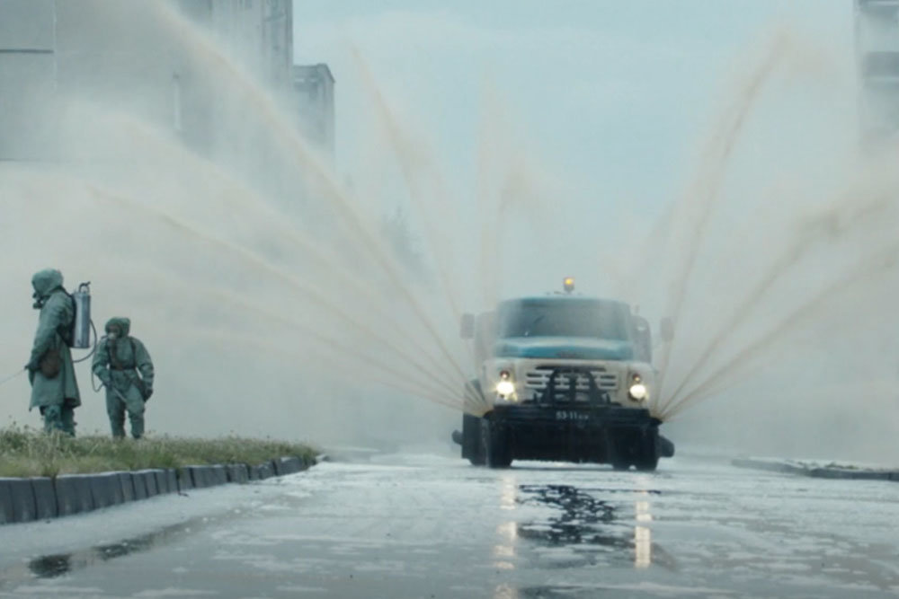 Un camión rocía agua por las calles de Pripyat, Ucrania, una ciudad que tuvo que ser evacuada después del accidente. A la izquierda, una imagen de la serie estrenada en 2019; a la derecha, un fotograma de un video tomado en 1986.