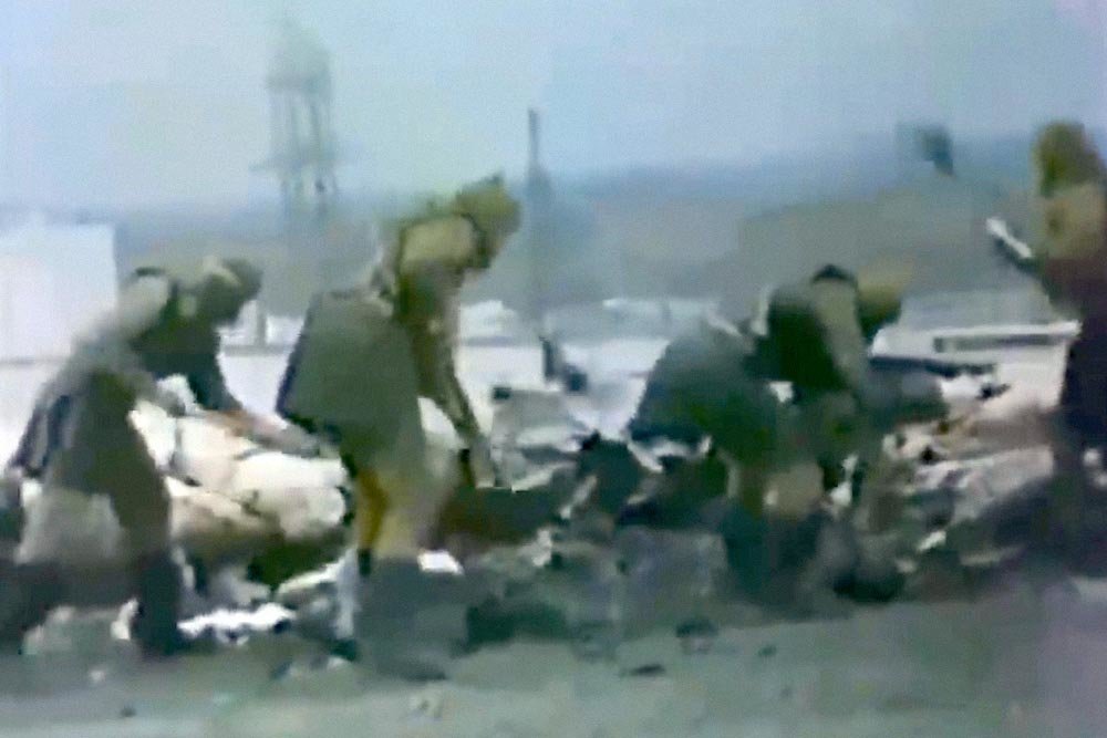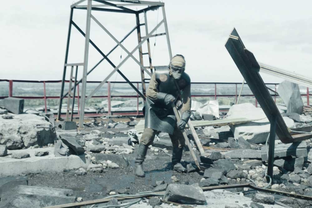 Obreros trabajando en una zona con altísimos niveles de radiación después de la explosión. A la izquierda, la escena de la serie; a la derecha, el momento real captado en un video soviético de la época.