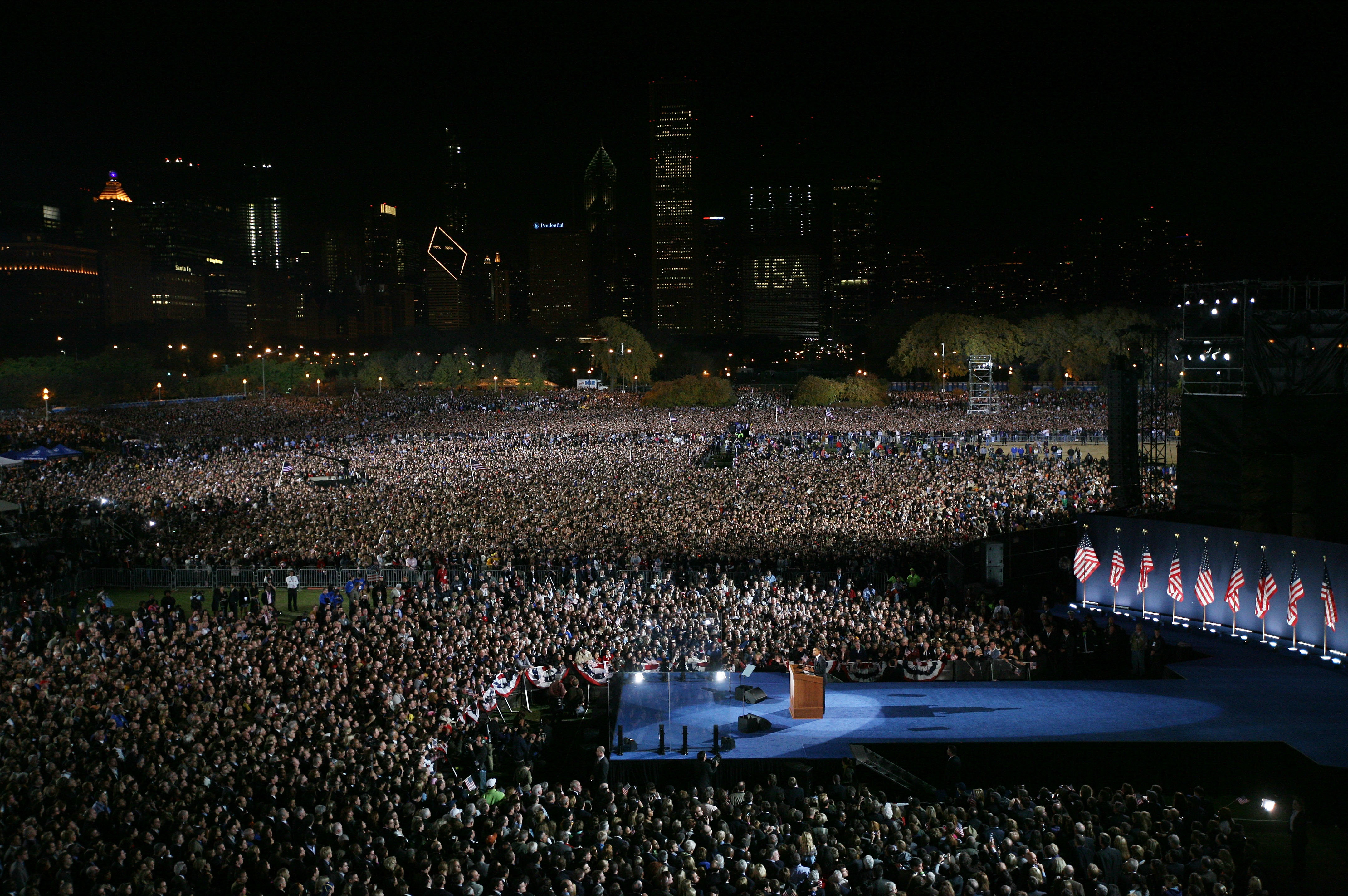 Barack Obama da su discurso de aceptación en el Grant Park, de Chicago, tras su victoria en las elecciones presidenciales. Obama, vivió la mayor parte de su vida en Chicago, donde conoció a su esposa Michelle, y crió a sus dos hijas; Malia y Sasha.