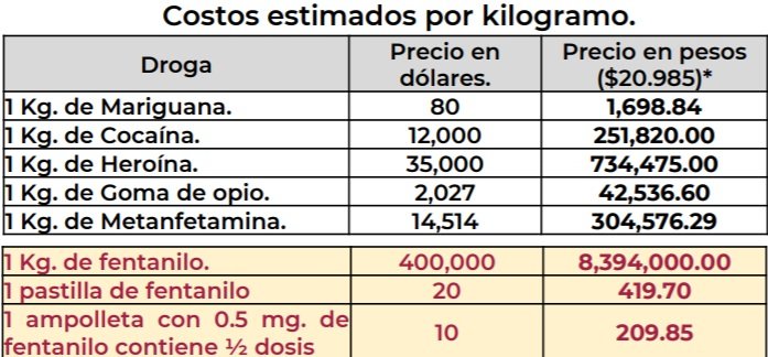 Sandoval mencionó que el costo por kilogramo de fentanilo es de aproximadamente de 400 mil dólares (8.3 millones de pesos).