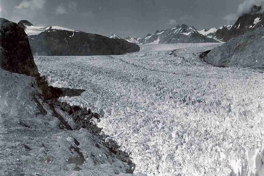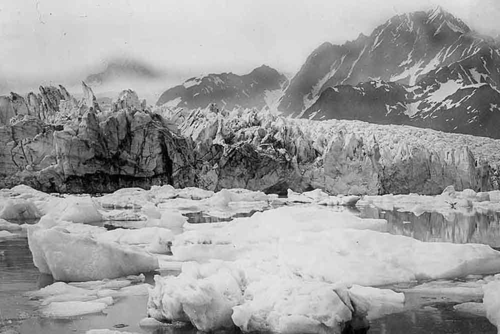 Glaciar Noreste, Alaska. Ubicado en el Parque Nacional Kenai Fjords, en los aproximadamente 60 a 80 años entre dos las fotografías, el glaciar del Noroeste se retiró unas 6 millas al noroeste, fuera del campo de visión.