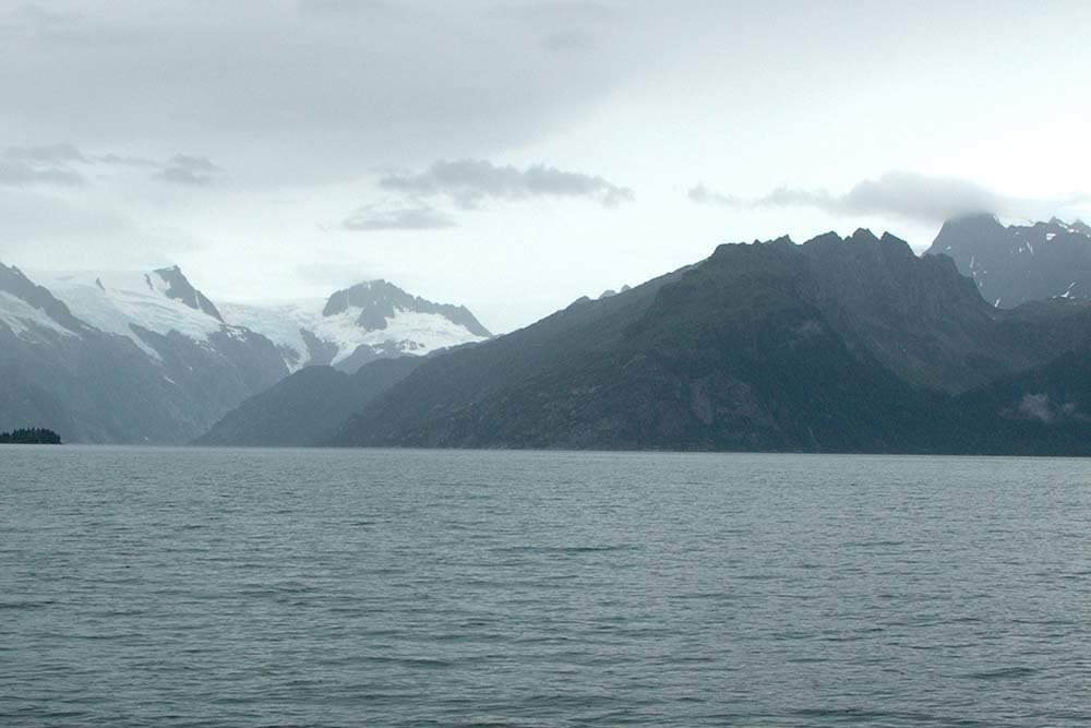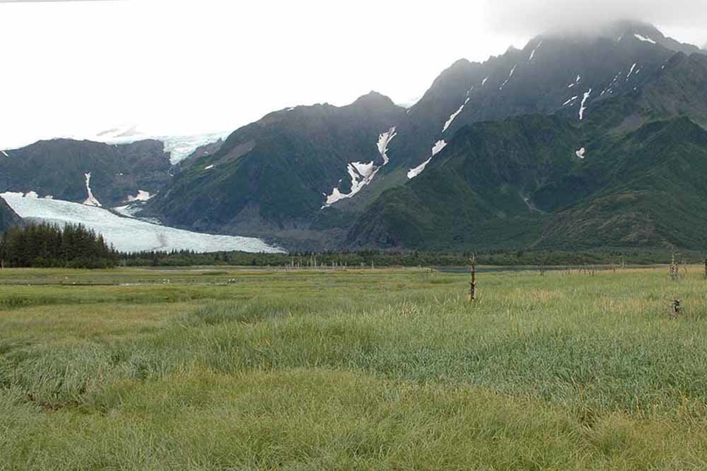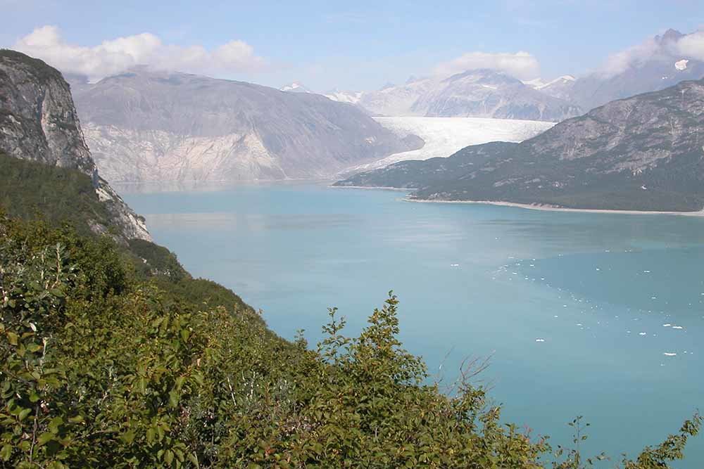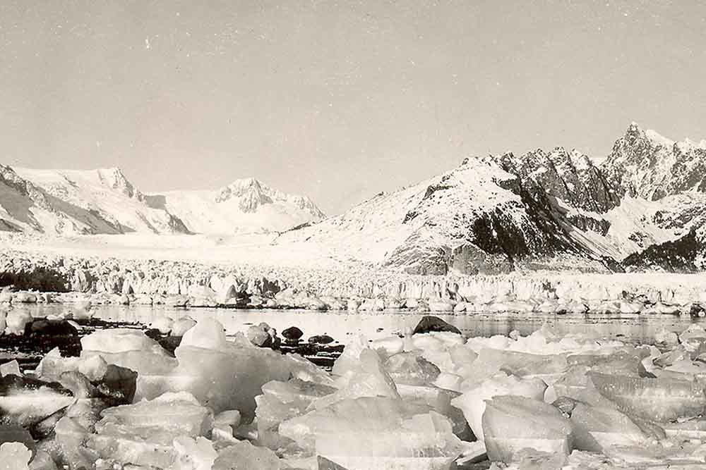 Glaciar Pedersen, Alaska. En la foto de 1920, en primer plano vemos una laguna adyacente a la bahía de Aialik, donde el glaciar Pedersen parecía un grupo de icebergs. En la fotografía de 2005, la mayor parte de la laguna se ha llenado de sedimentos con hierbas, arbustos y plantas acuáticas. El glaciar Pedersen se ha retirado más de una milla