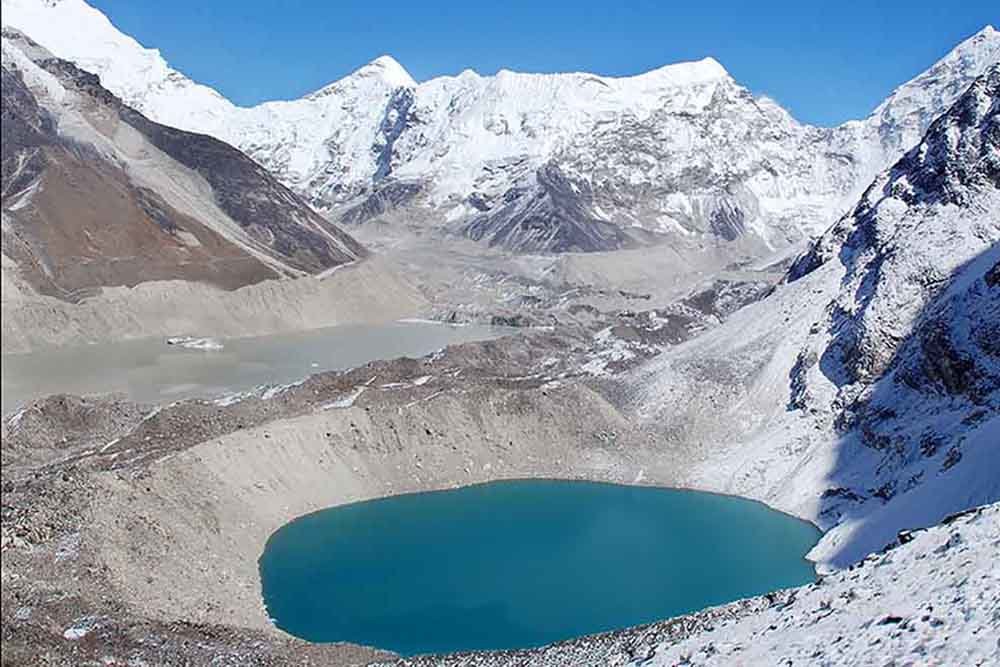 Glaciar Imja, Himalayas. El lago Imja, cuerpo de agua grisáceo que está sobre el azulado lago Amphu, en la imagen de 2007, amenaza con inundar a las comunidades río abajo. Es parte de una serie de estanques que se han formado a medida que los glaciares se han retirado y adelgazado.
