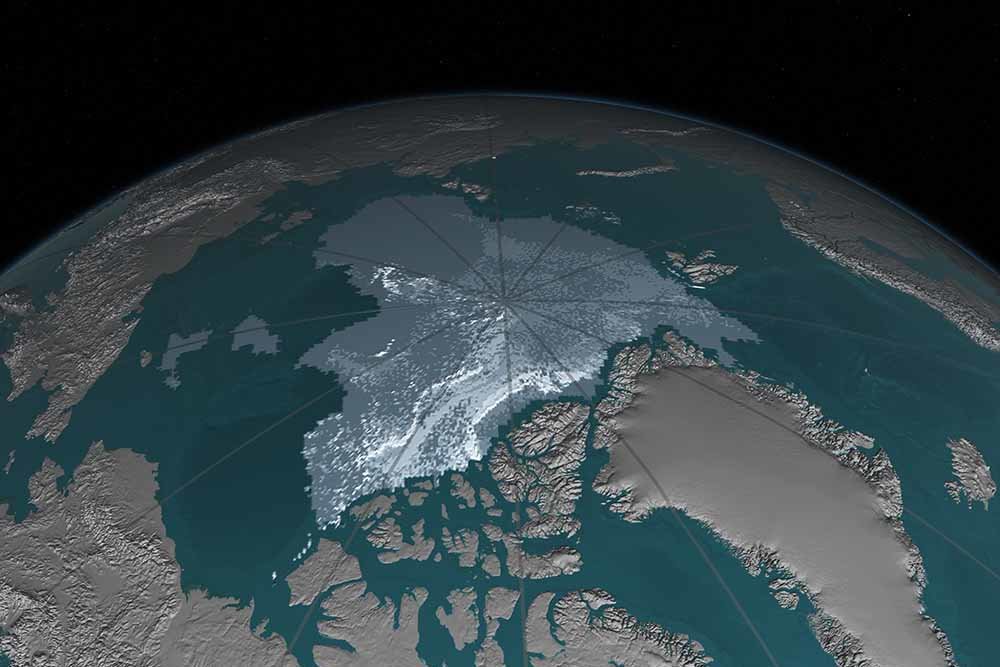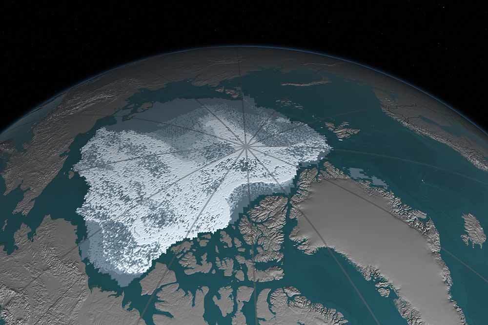 Reducción del hielo antiguo en el océano ártico. El área cubierta por hielo de al menos cuatro años de antigüedad ha disminuido de 1,155,750 millas cuadradas en septiembre de 1984 a 68,350 millas cuadradas en septiembre de 2016. El hielo más viejo tiende a ser más grueso y menos vulnerable a la fusión que hielo más reciente. En estas visualizaciones, construidas con de datos de boyas, estaciones meteorológicas, satélites y modelos informáticos, la edad del hielo es indicada por tonalidades que van desde el gris azulado para el hielo más joven hasta el blanco para el más antiguo.