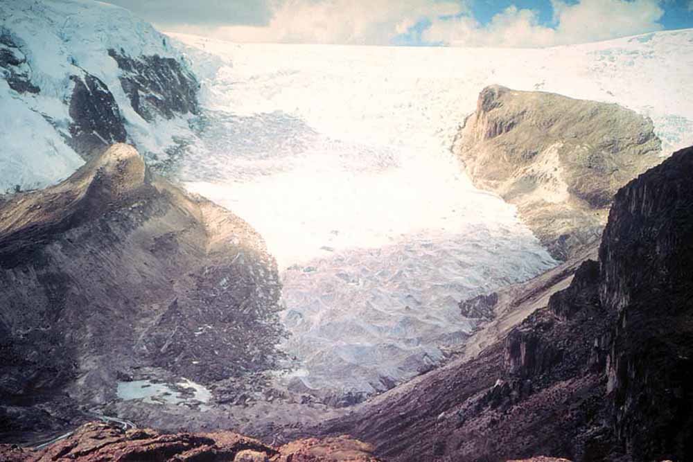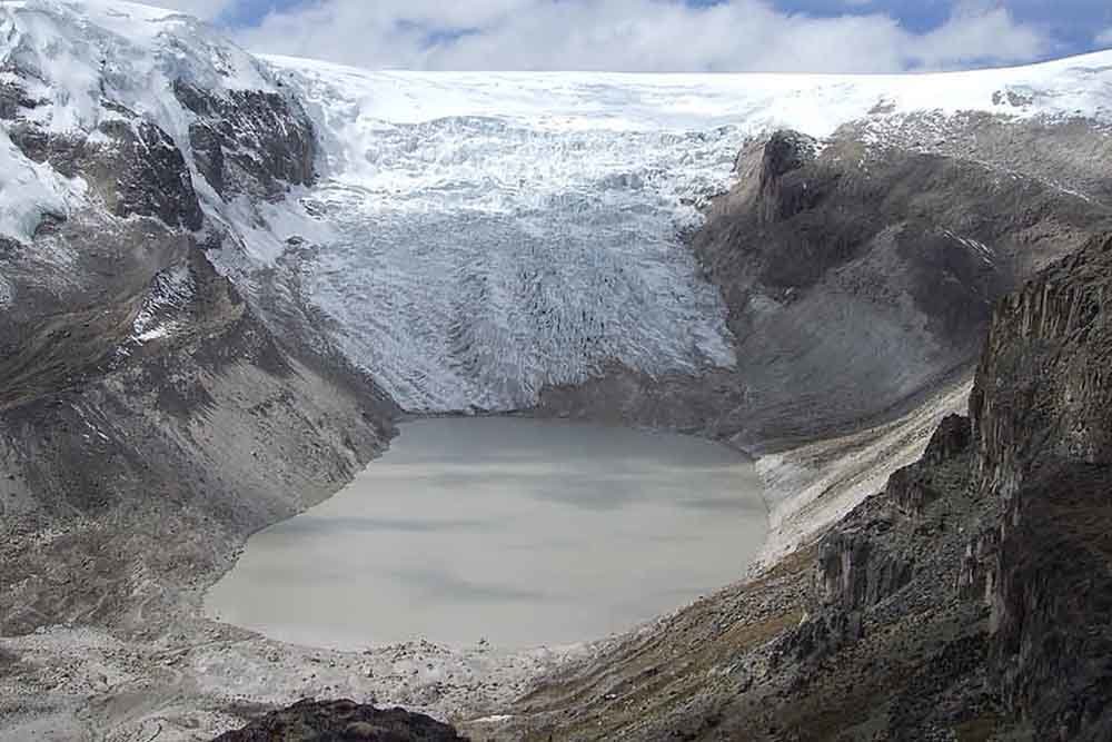 Glaciar Qori Kalis, Peru. En 1978, el glaciar Qori Kalis crecía, pero en el año 2011, el glaciar se había retirado completamente de nuevo a tierra, dejando un lago de unos 86 acres en el área y cerca de 200 pies de profundidad. Este glaciar es el más grande en Quelccaya, la capa de hielo tropical más extensa del mundo, a 5,691 metros de altura en la cordillera de los Andes.