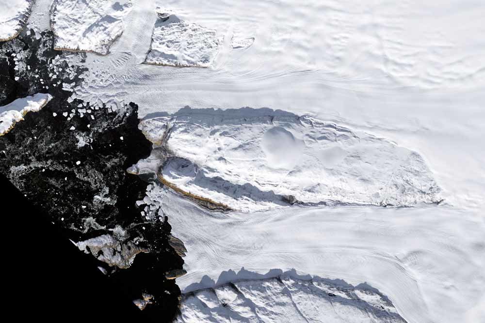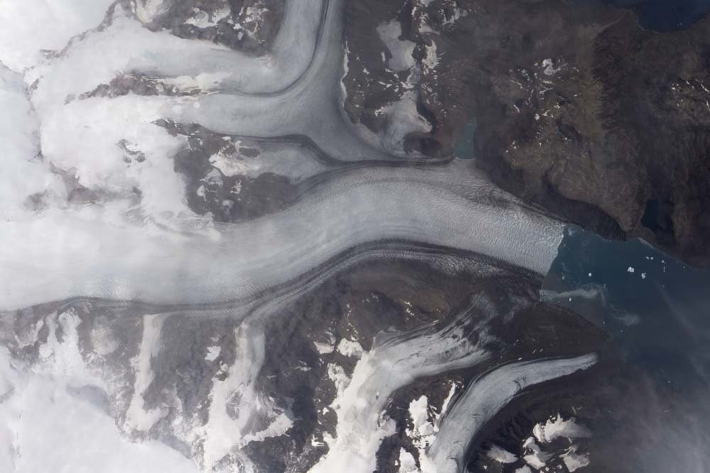 Los glaciares de Tracy y Heilprin, en Groenlandia. Tracy (arriba) y Heilprin (abajo) son los dos glaciares más grandes que desembocan en Inglefield Bredning, un fiordo en la costa noroeste de Groenlandia. Se redujeron a tasas similares en los años 80 y 90, aproximadamente 125 pies (38 metros) y 118 pies (36 metros) por año, respectivamente. Pero entre el 2000 y el 2014, la tasa de pérdida de Tracy aumentó a unos 1,194 pies (364 metros) por año, más de tres veces más rápido que los 358 pies (109 metros) de Heilprin por año. La razón probable de la diferencia es que Tracy fluye hacia un canal mucho más profundo de agua de mar, haciéndolo más vulnerable a derretirse a medida que el agua de mar se calienta.